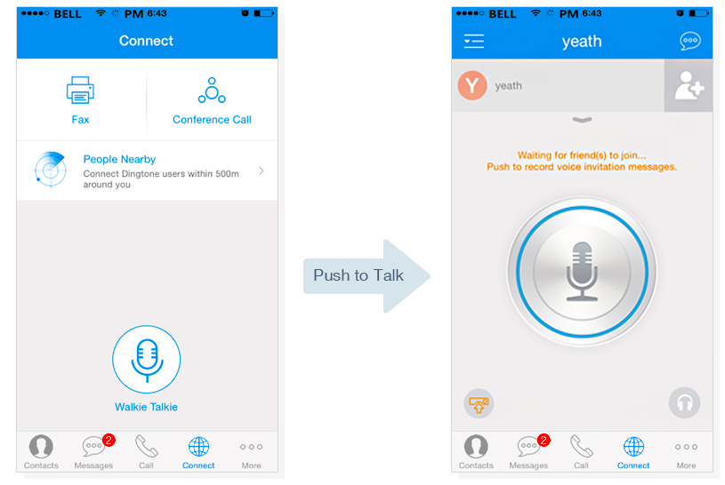 Dingtone transforms your phone into a real walkie-talkie—you simply push a button and speak. It works just like a two-way radio!